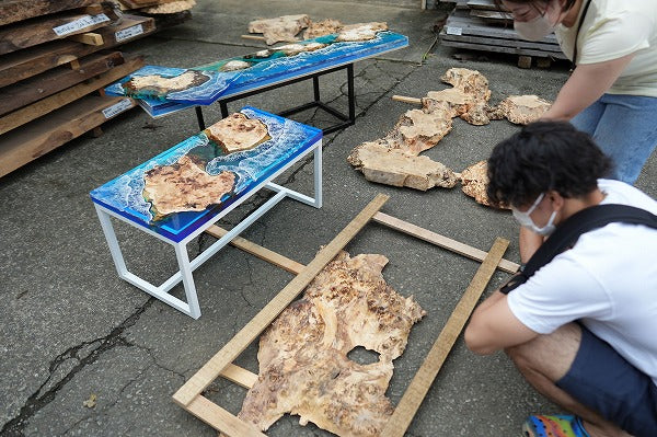 RESIN SPACEはオーダーに強みを持つレジンテーブルブランドとなり、オーダーで培ったデザイン力を作品へ込めています。倉庫では完成品の購入はもちろん、隣の一枚板倉庫でお気に入りの一枚板を見つけたらオーダーに切り替えることも可能です。